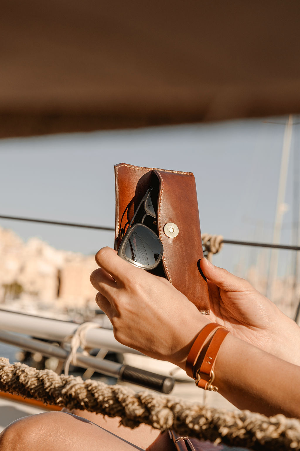 Crafted to safeguard your eyewear, our leather sunglasses case is both soft and durable, designed to accommodate any size of glasses. The case is meticulously designed and stitched with robust thread and features a double-walled interior for added rigidity, along with a magnetic snap for effortless closure. This case is not just a protective layer but a lifetime investment for your shades.