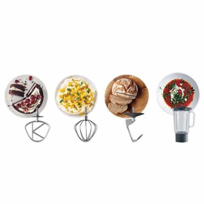 Material: Body – Die-Cast Metal, Bowl – Stainless Steel, Bowl Tool – Non-Stick Coated Aluminium, Liquidiser - Acrylic | 1200W | Capacity (L): Bowl - 6.7, Liquidiser - 1.6 | Capacity (kg): Cake – 4.55, Dough – 2.56, Flour for Pastry – 0.91 | Accessories: Spatula, Bowl, Whisk, K-Beater, Dough Hook, Liquidiser | Safety Features: Splashguard