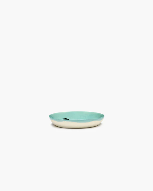 This apple blue-sea-green serving dish with an abstract depiction of broccoli reflects Ottolenghi's distinctive cuisine. The combination of colors and brush strokes creates a cheerful whole.