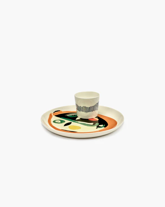 This playful earthenware plate is cream-colored and has a painting of a face in black, orange and green. This plate is available in different sizes.