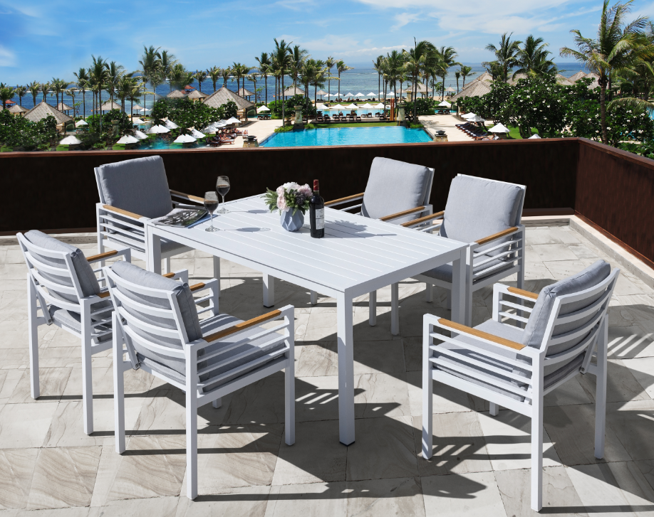 ake a seat and relax for a while with a Prosca Dining set.Teak armrest with warmth and comfort.Perfect for poolside, patio, garden, and more outdoor areas.