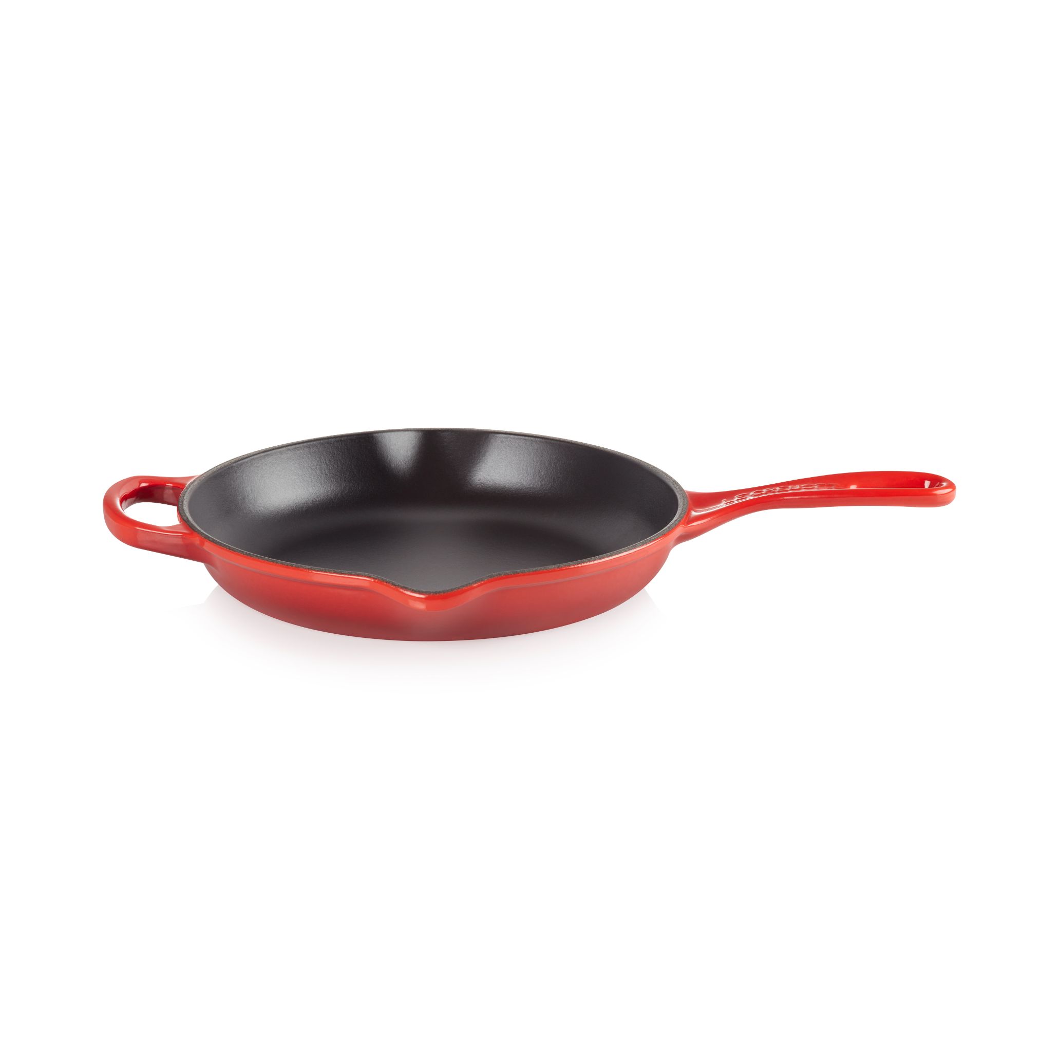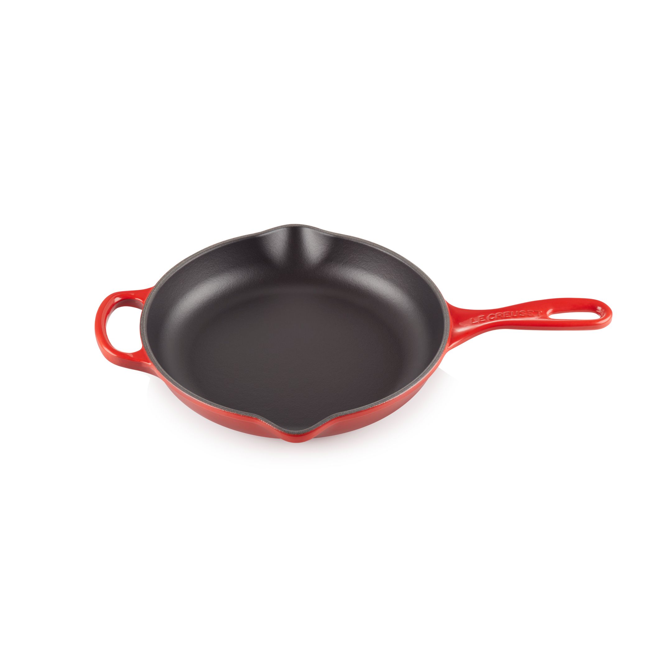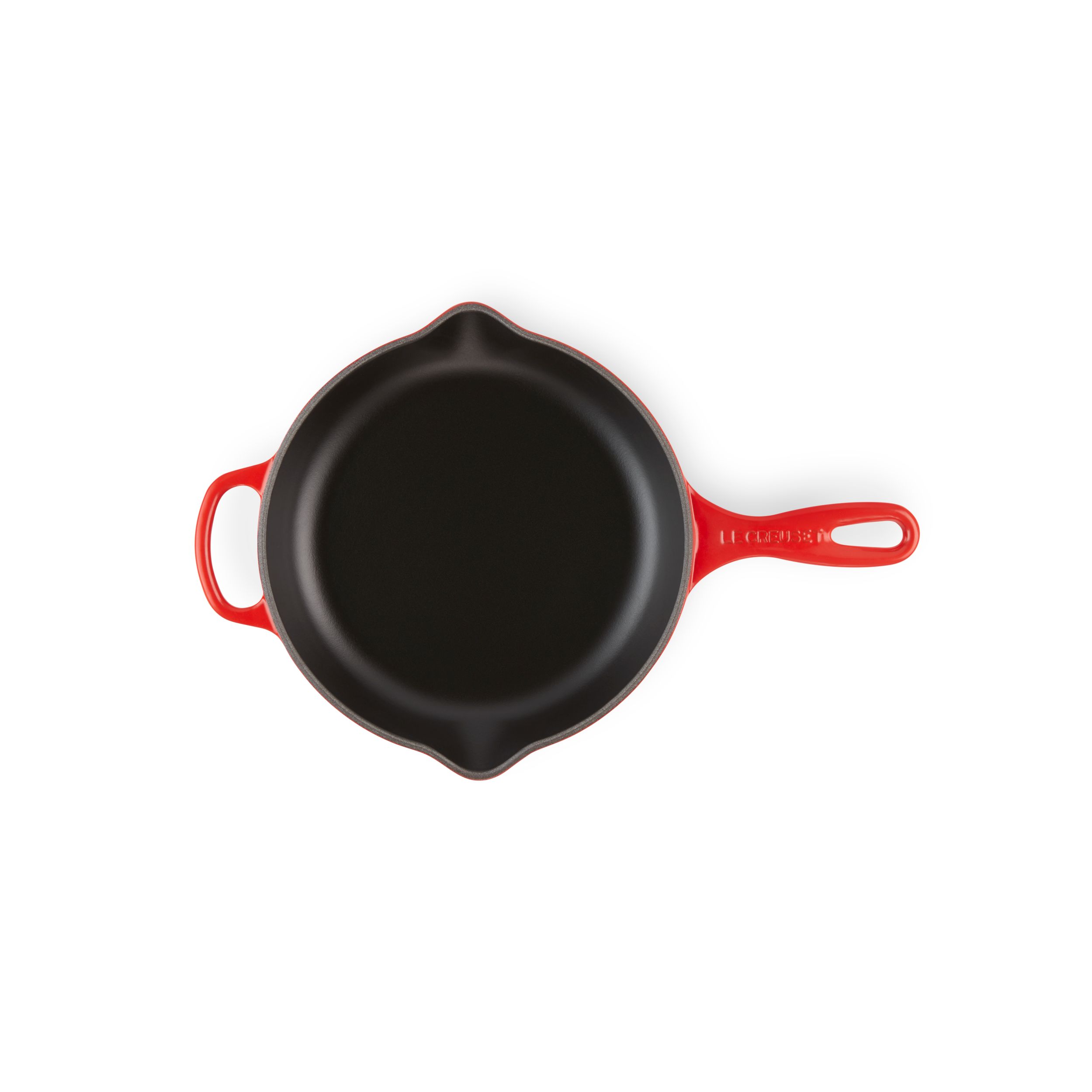 Le Creuset's Signature Skillet features a convenient helper handle for easier lifting and added control when moving between hob, oven and table. There are spouts on two sides allowing for drip-free pouring.