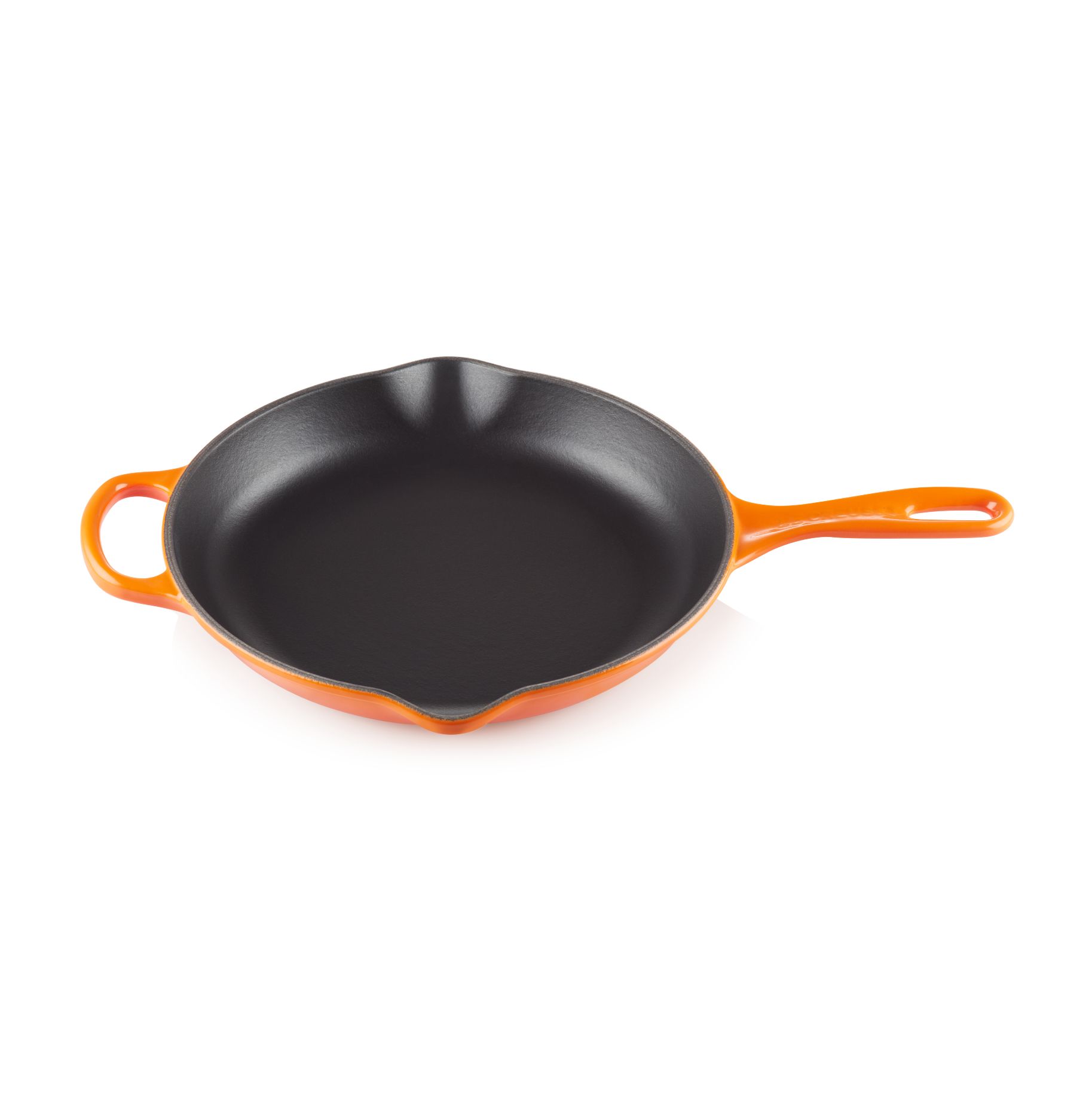 The Skillet is coated with Le Creuset’s specialist satin black enamel finish. Very durable and easy to clean, the satin black enamel interior has been especially designed to protect the pan (no seasoning is required) and for high surface heat use. Over time, it develops a natural patina that is ideal for searing, browning and frying.