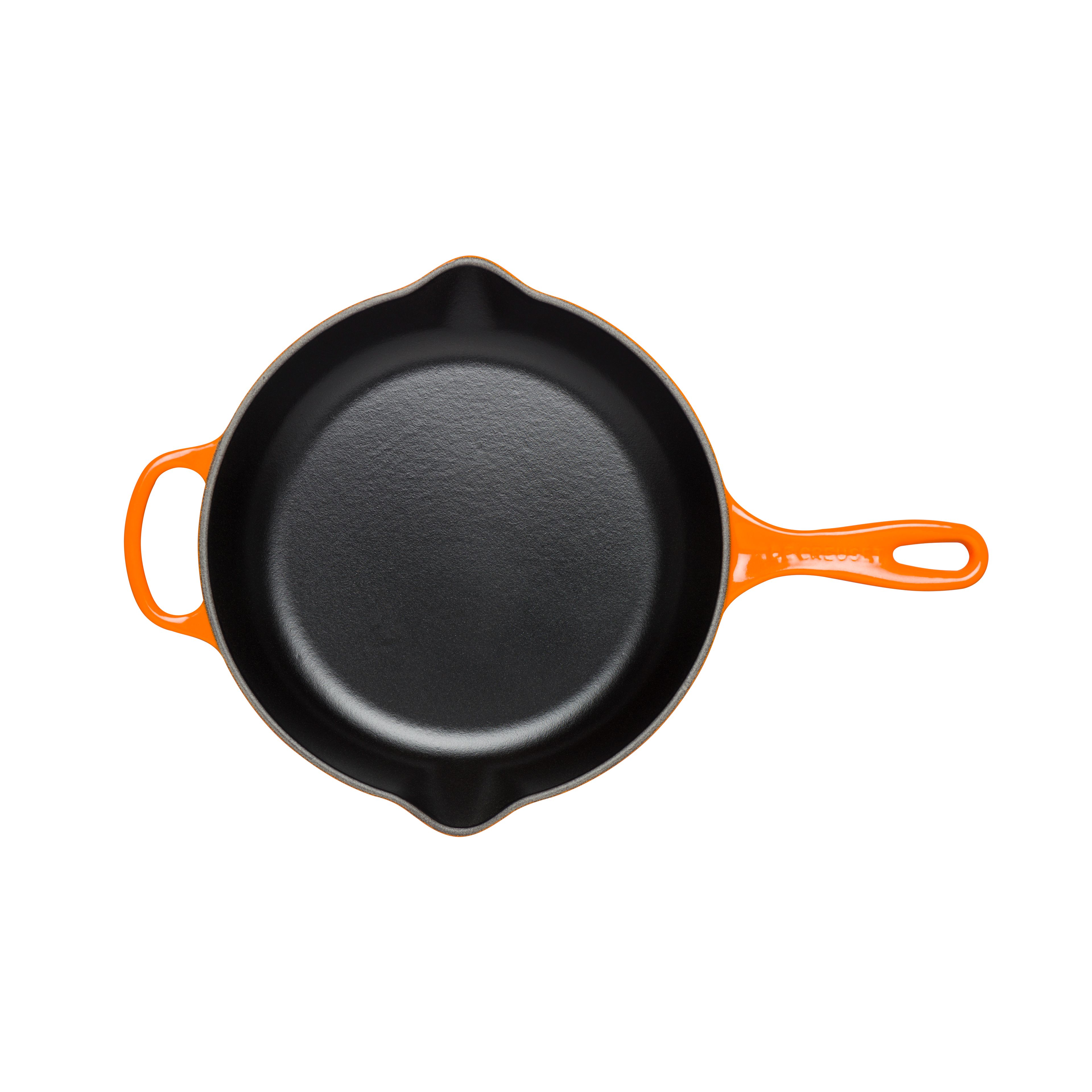 Le Creuset's new Signature Skillet features a convenient helper handle for easier lifting and added control when moving between hob, oven and table. There are spouts on two sides allowing for drip-free pouring.