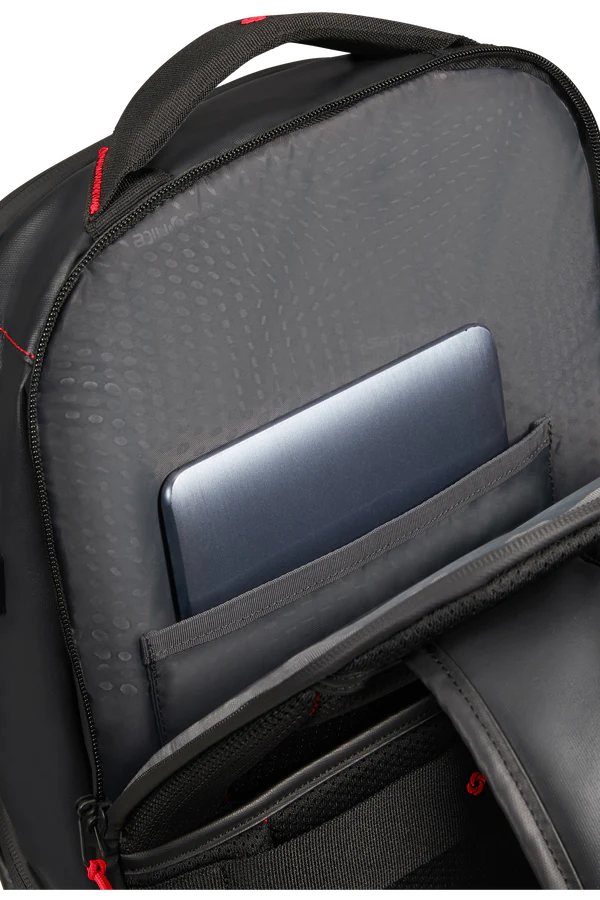 Black sofside laptop backpack part of Ecodiver sustainable collection setting a new standard within our casual assortment. This collection combines practicality with a stylish design and was developed with special attention to security and comfort. Using recycled materials, Ecodiver perfectly matches our 'Responsible Journey' strategy. The water-resistant coating makes this range the perfect choice for all your outdoor adventures and endless strolling in the city.