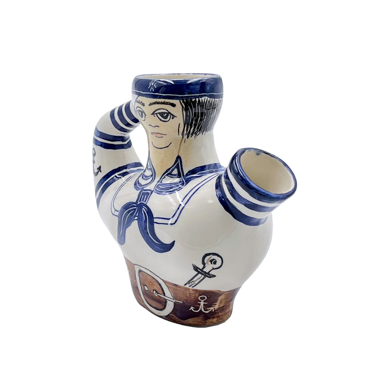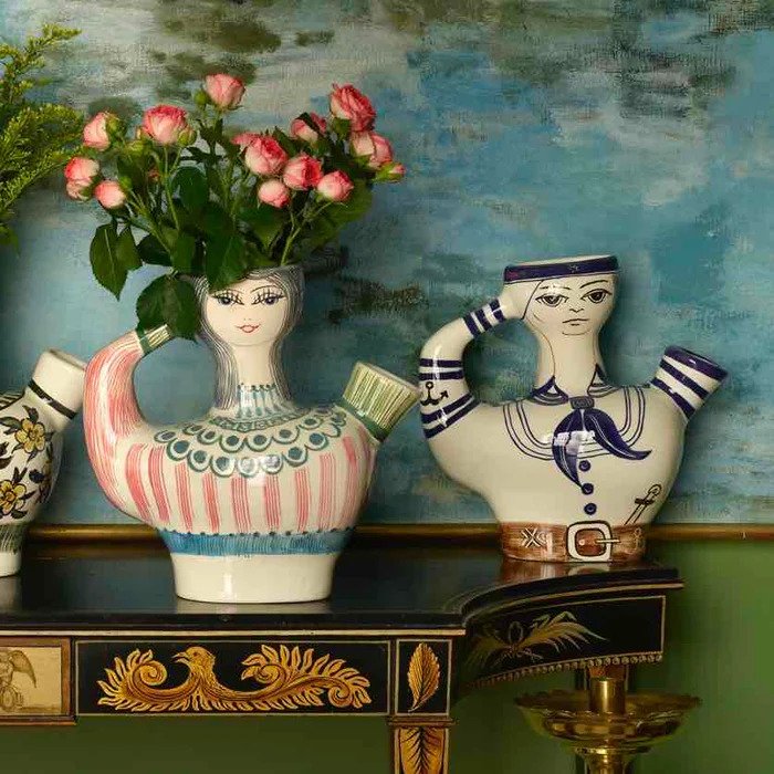Many decades ago, the late Aldo Cremona, a master painter who worked at Villa Bologna Pottery for 65 years, decided that he'd had enough of painting only men and decided to turn some of our Admiral vases, a nod to Malta's seafaring military history, into women. Everyone liked them so much, we kept them. Now you can choose between handsome sailors in striped tops, or winsome women bedecked in jewellery. Both look beautiful with a bunch of fresh flowers.