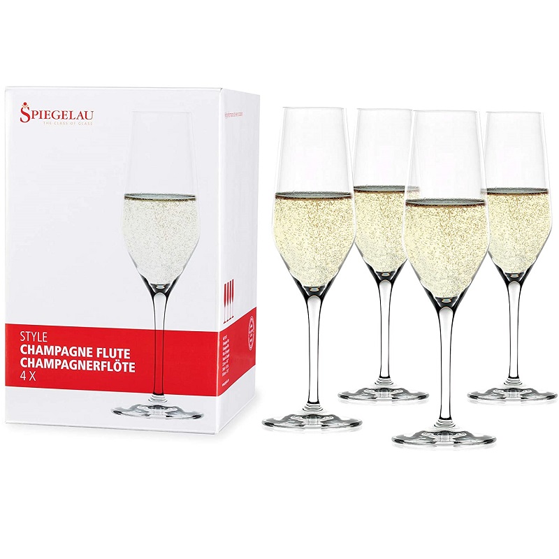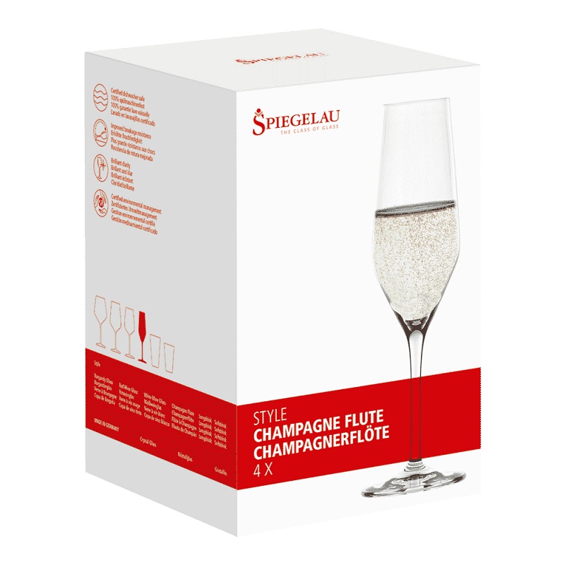 Style champagne wine glasses measuring 225mm tall is available as a set of 4 glasses in a Spiegelau Gift box.