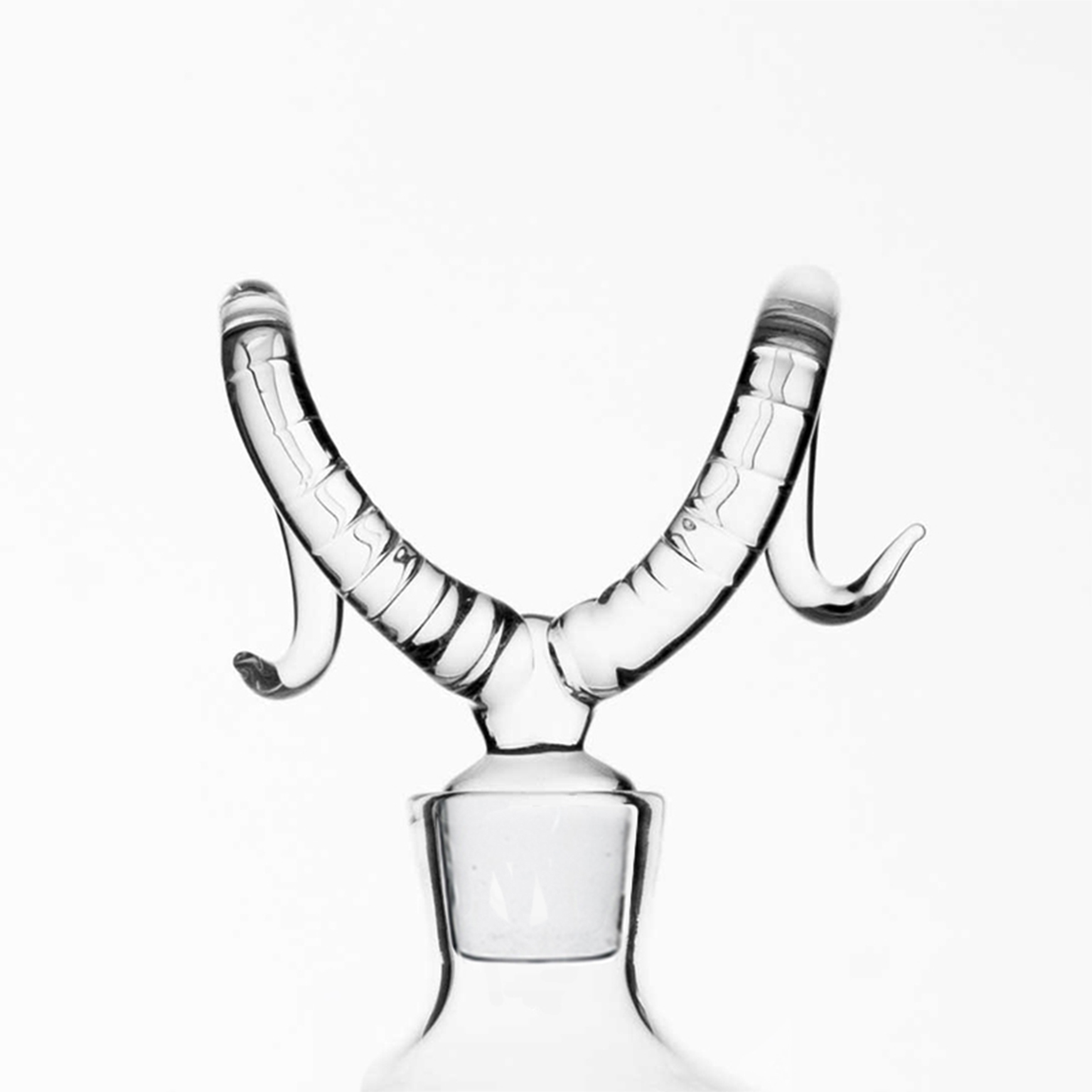 A Hand Blown Glass Bottle by Simone Crestani. A collection of bottles with linear shapes that reserve a surprise at the top. Elk, antelope, deer, or buffalo? Each trophy represents in detail the horns of a wild animal and dedicates a poetic hymn to the inhabitants of the most pristine nature.