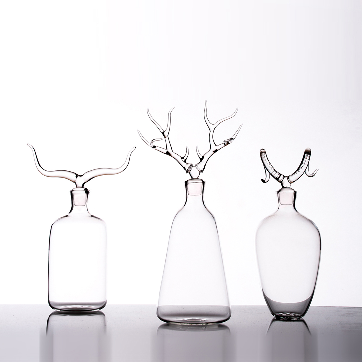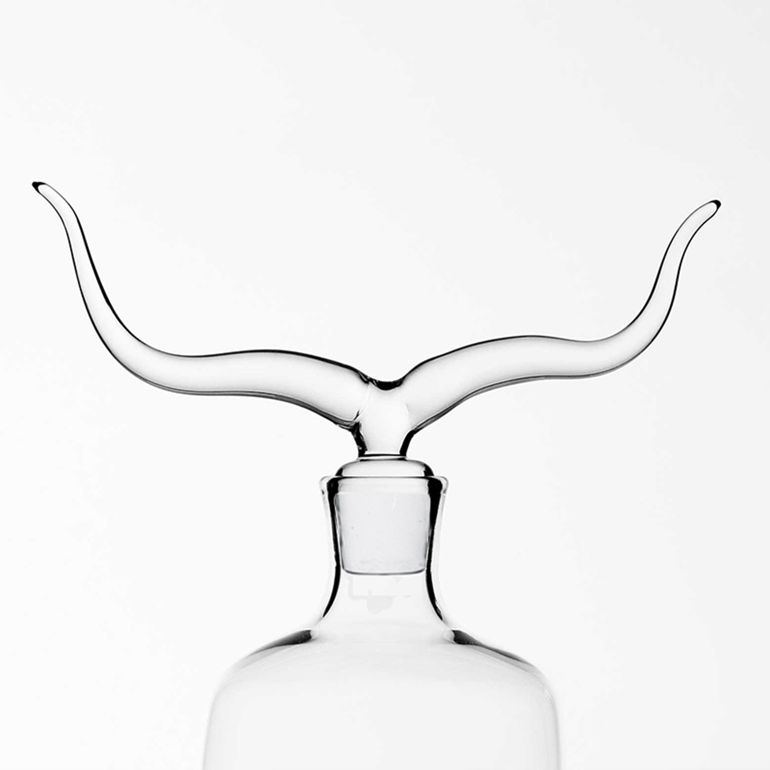 A Hand Blown Glass Bottle by Simone Crestani. A collection of bottles with linear shapes that reserve a surprise at the top. Elk, antelope, deer, or buffalo. Each trophy represents in detail the horns of a wild animal and dedicates a poetic hymn to the inhabitants of the most pristine nature.