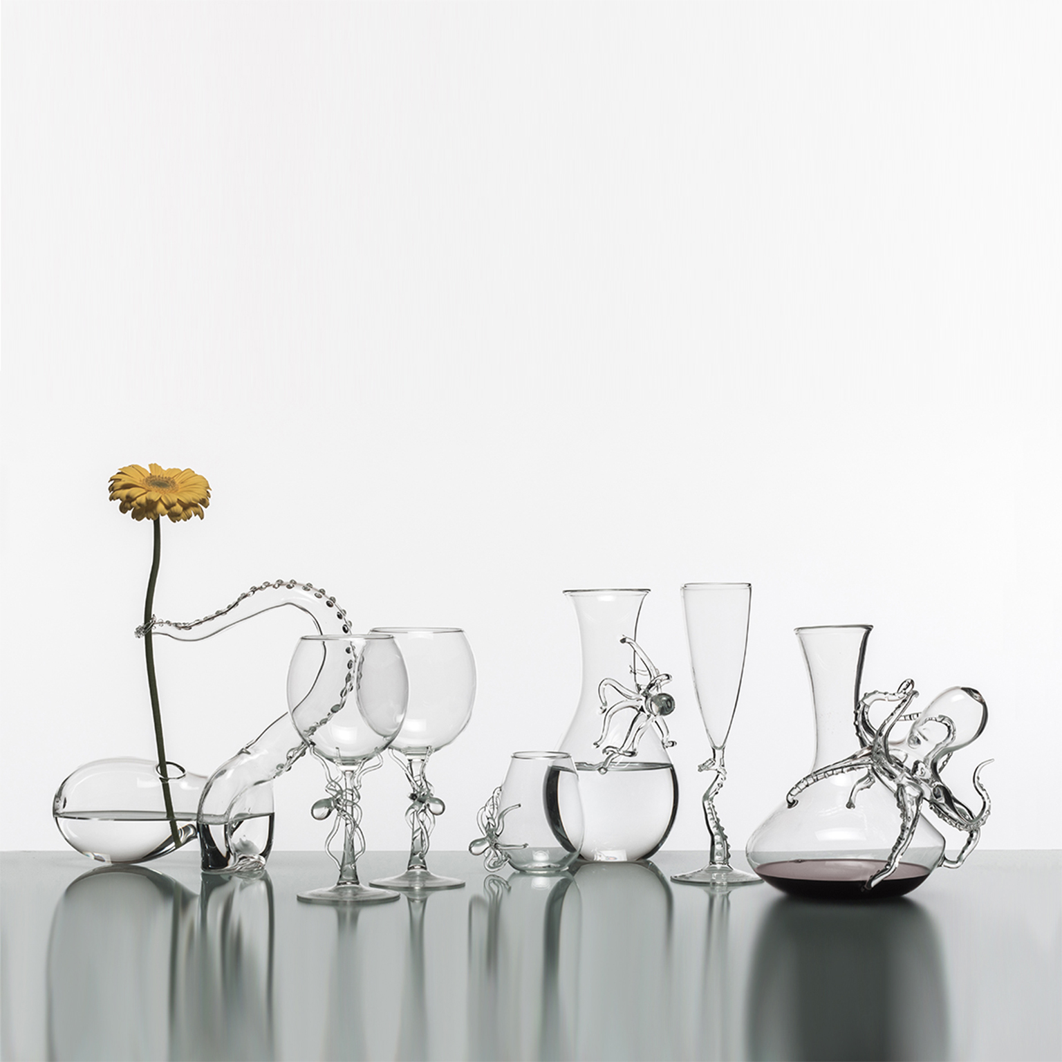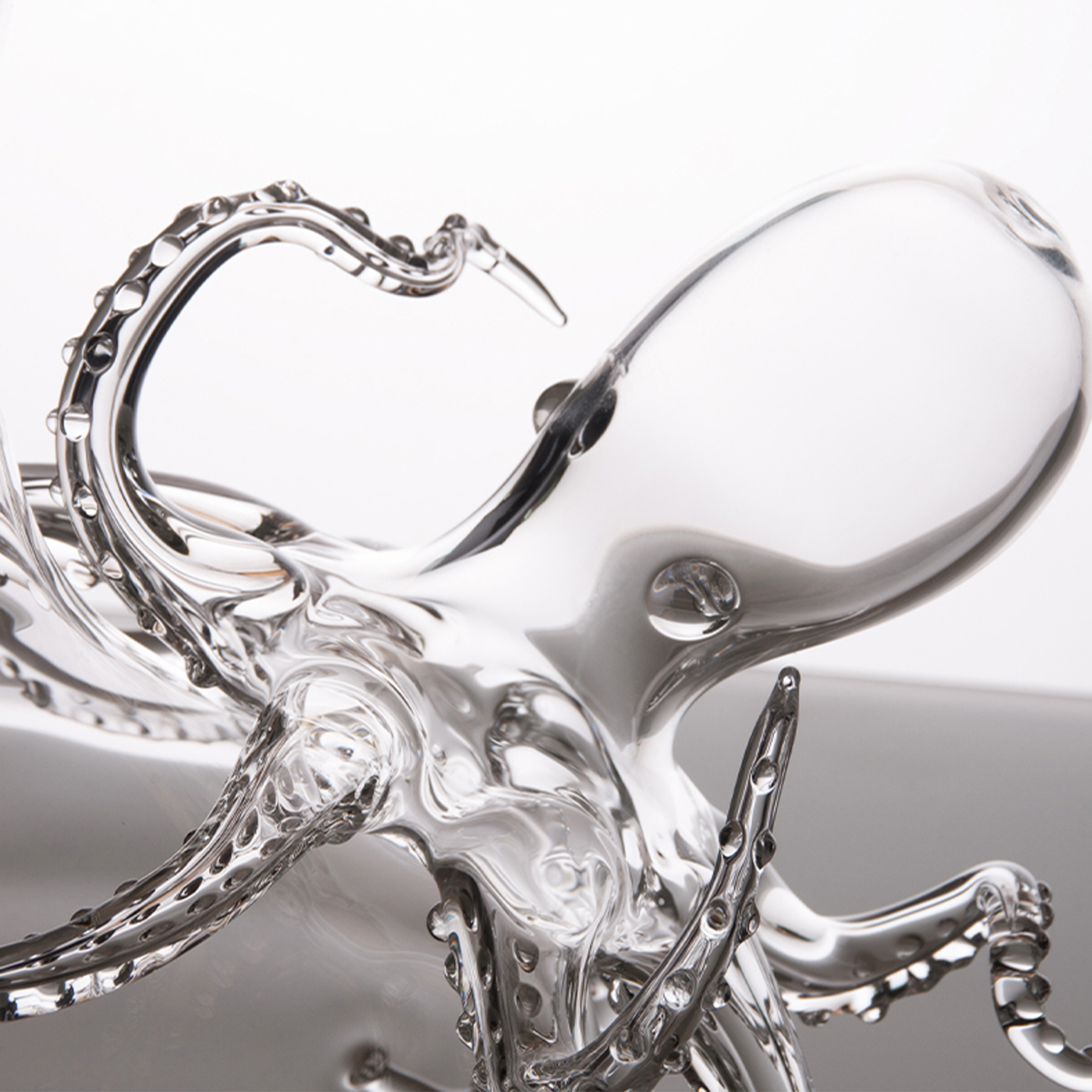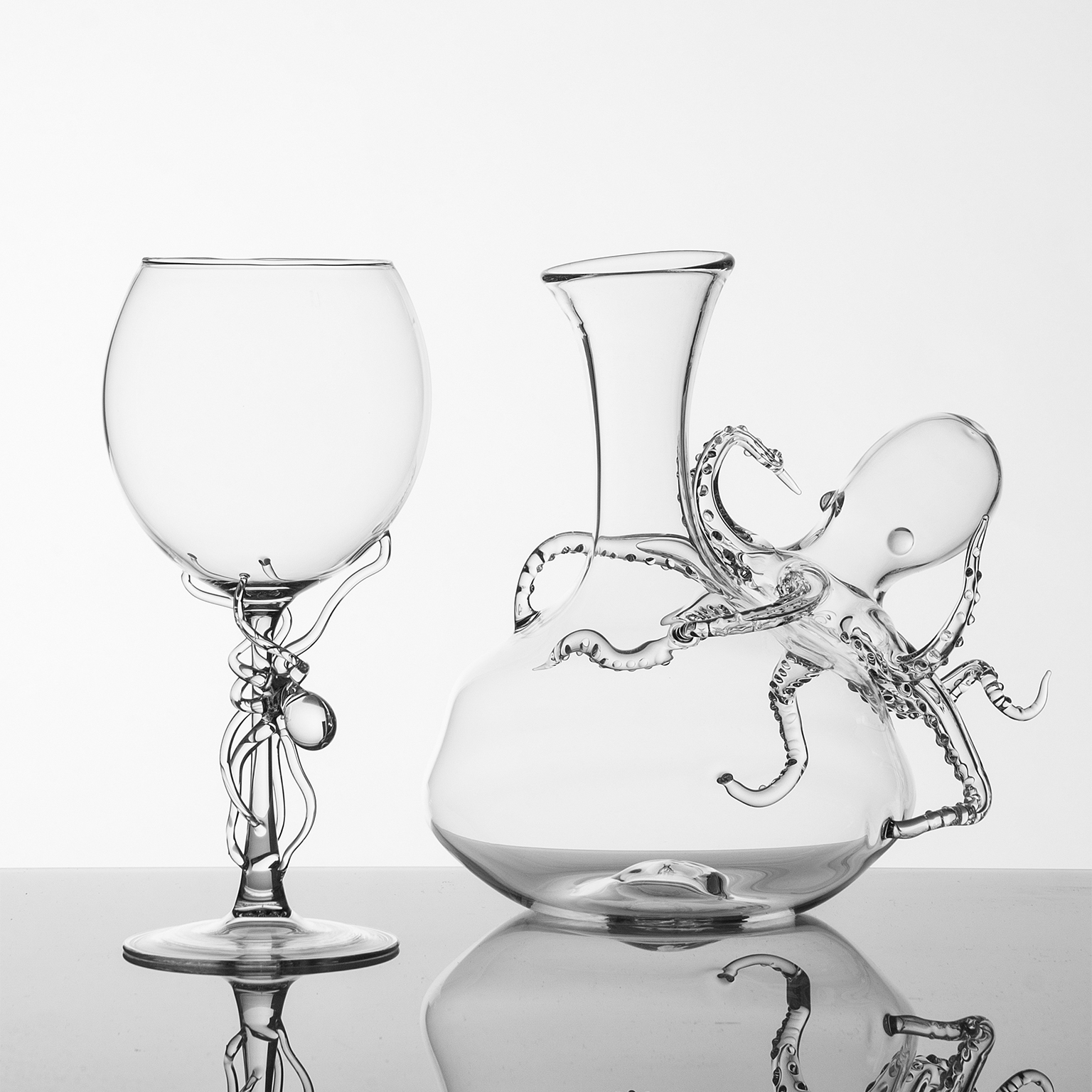 A Hand Blown Glass Decanter by Simone Crestani. "The enveloping elegance of the Polpo Collection may make you believe that the animal is really wrapping the decanter or climbing up the stem of the glass. Details are recreated with great precision in homage to these extraordinary creatures that inhabit the sea and act furtively without being seen.