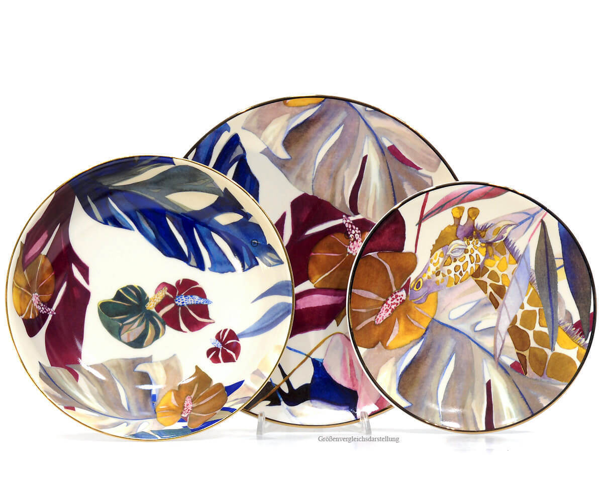 Flora and fauna of the savannah find space in a line that is not afraid to dare. The combination of rich shades gives each piece authenticity and charm, bringing you in an exotic and wild world, capable of making you feel contaminated by the unusual combination of strong and eccentric colours.?Made from porcelain