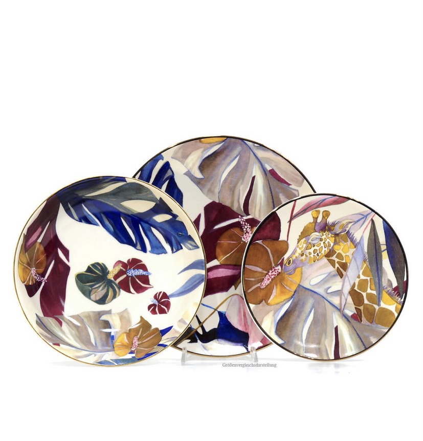 Flora and fauna of the savannah find space in a line that is not afraid to dare. The combination of rich shades gives each piece authenticity and charm, bringing you in an exotic and wild world, capable of making you feel contaminated by the unusual combination of strong and eccentric colours.?Made from porcelain.