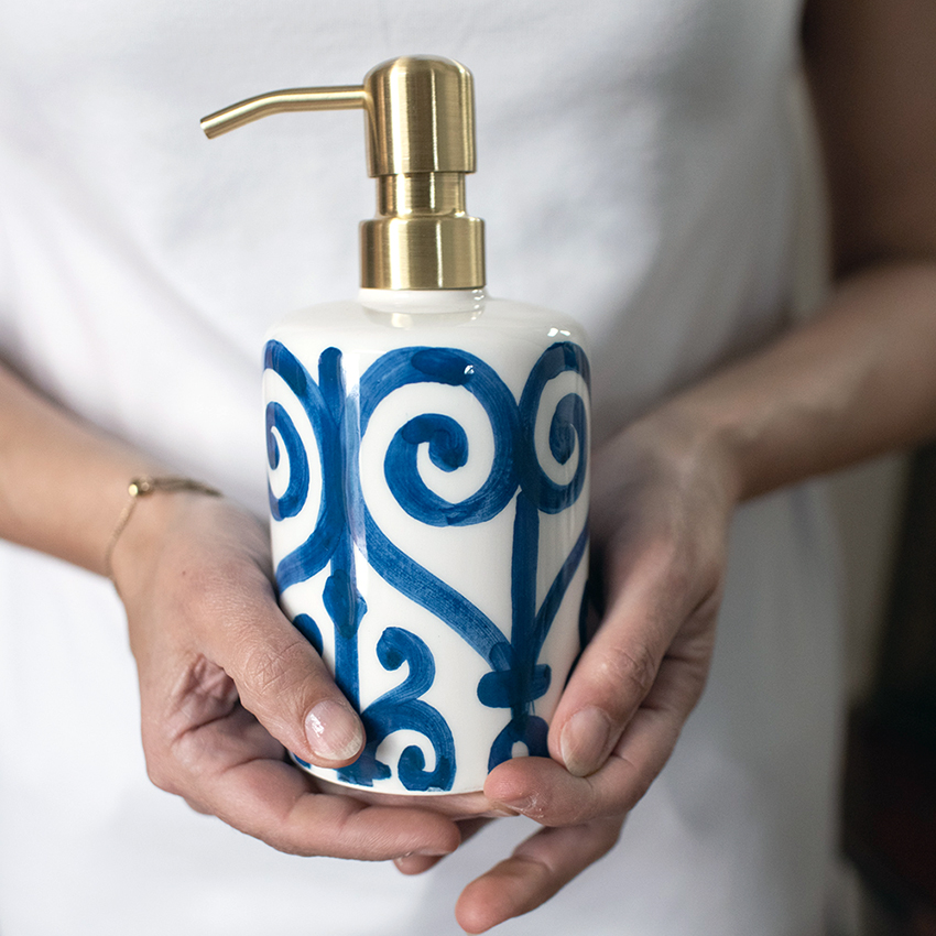 Add a touch of elegance to your bathroom or kitchen with this hand painted ceramic soap dispenser finished off with a brushed gold stainless steel pump. And since we’re all using hand sanitizer, why not get rid of plastic bottles and invest in an aesthetically pleasing dispenser for your home, hotel or office?